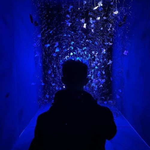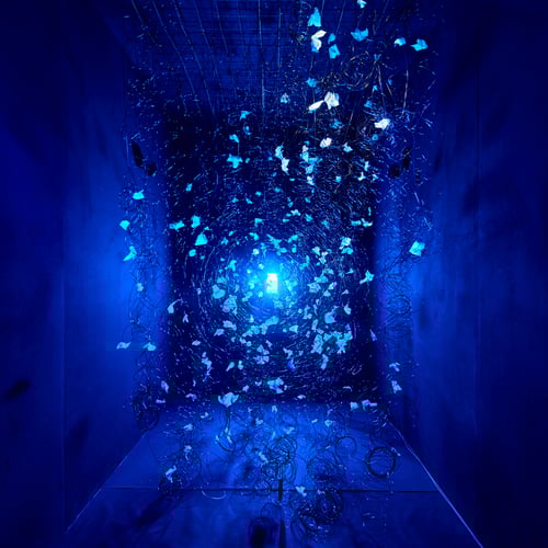 SWARM FIELD: The Power of Light Attraction은 디지털 기술과 자연의 유기적 형태를 결합하여 자연과 산업을 연결하는 인터랙티브 설치 작품이다. 천장에 매달린 곤충의 고치를 연상시키는 조형물은 변화와 탈바꿈을 상징하며 끊임없이 변 화하는 유기적 구조를 담고 있다. 레이저 프로젝션은 이 작품에서 핵심적인 역할을 하며, 관객의 손짓에 실시간으로 반응한다. 관객이 공간과 상호작용하며 손짓할 때마다 조형물과 주변 환경에 빛의 파동이 퍼져 나가는데, 이는 빛에 끌리는 반딧불이나 나방과 같은 야행성 곤충들의 행동을 모방한다. 이처럼 작품은 인공 조명이 지배하는 현대 환경에서 생물들이 어떻게 적응하고 살아남는지를 생각해보게 한다.