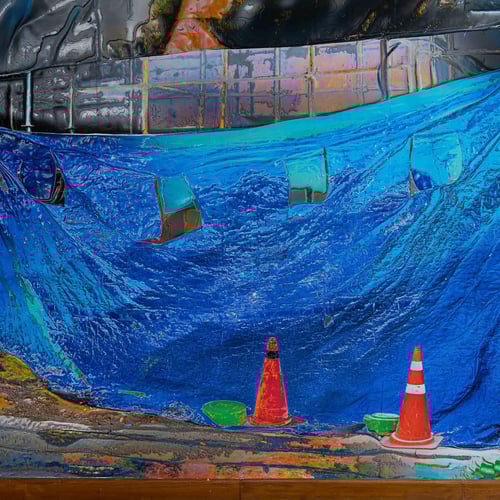 <화면의 표면>은 공사장에서 흔히 볼 수 있는 파란색 타포린 천막을 다룬 작업으로 <Sequince>처럼 공사장의 모습을 촬영한 이미지를 기반으로 한다. 작가는 3D 이미지를 통해 빛을 왜곡하고, 노멀 맵핑(Normal Mapping)과 포토샵의 자동 선택 도구Magic Tool를 활용하여 디지털 조작의 흔적을 의도적으로 드러낸다. 이 작품에서 파란색 타포린 천막은 크로마 키Chroma Key 블루 스크린을 은유적으로 상징하며, 기술적 개입을 완벽히 감추는 동시에 그 기능이 왜곡되거나 실패한 상태를 연상시킨다. 이 천막은 단순한 가림막을 넘어, 그 뒤에 숨겨진 현실을 드러내는 도구로 변모한다.