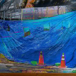 이 작품에서 파란색 타포린 천막은 크로마 키Chroma Key 블루 스크린을 은유적으로 상징하며, 기술적 개입을 완벽히 감추는 동시에 그 기능이 왜곡되거나 실패한 상태를 연상시킨다. 이 천막은 단순한 가림막을 넘어, 그 뒤에 숨겨진 현실을 드러내는 도구로 변모한다.